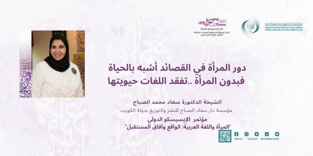 وبدورها، قالت الشيخة سعاد الصباح، مؤسسة دار سعاد الصباح للنشر والتوزيع، “إن الكلمة أنثى كما هي الحضارة والحياة والغمامة والقصيدة، وبلا أنوثة تفقد اللغة جماليتها وأمومتها والجنة التي تستريح تحت قدميها”، مؤكدة على الجهود التي بذلتها مؤسستها من أجل تحبيب اللغة العربية للأجيال عبر إحداث دار نشر تساهم في تشجيع تعلم اللغة العربية.