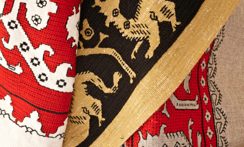 الألوان السائدة هي الأبيض والأسود والاحمر الداكن. يتميز بزخارف تمثل الأسود والغريفين الحيوان الميتافيزيقي والطيور والنسور والطاووس والأرانب والفيلة والحيوان الغامض، التنين. يمكن عمل التطريز على الصوف والقماش والكتان والأكثر دقة على القماش المسمى الخارقة السيسية.