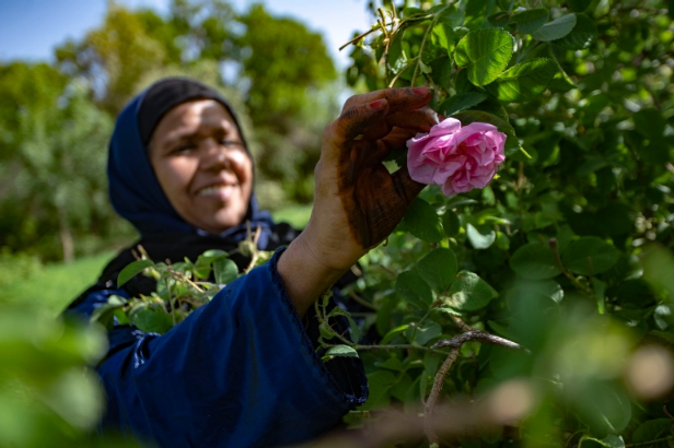 تغطي “يطو” وجهها بعناية، وتواجه الشوك دون قفازات. تتحرك أصابع يديها بخفة بين صفوف الورد المترامية الأطراف بقرية آيت يحيا، فقيمة عملها تقدر بالكيلوغرام مما تجنيه، حيث تتقاضى العاملات 3 دراهم (أقل من نصف دولار) عن كل كيلوغرام مما يقطفن.