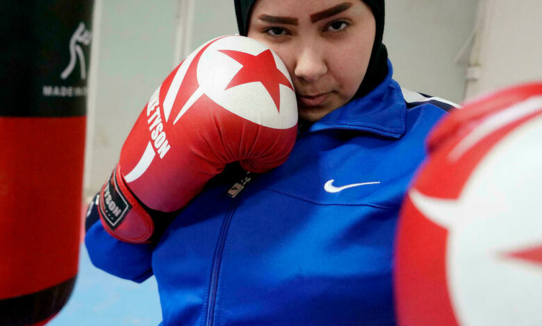 تسدّد علا مصطفى البالغة 16 عاماً، مفعمة بعلامات التحدي على وجهها، لكمات متسارعة لكيس الملاكمة، مرتدية الحجاب وًملابس رياضية بيضاء.
