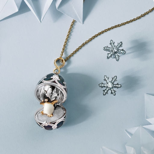 تواصل دار Fabergé تقليدها السنوي بطرح المفاجآت كل موسم، مع قلادة جديدة تتّسم بتصميم آسر يشمل طائر بطريق راقص يختبئ بداخلها. تأتي هذه القلادة لتشكّل أجدد إضافة إلى مجموعة Heritage التي تحتفي بولع الدار بعنصر المفاجأة وذكاء التصميم، وتنطوي على أساليب تصاميم تقليدية معقّدة، مثل فنّ الزخرفة والنحت اليدوي الدقيق. صُمّم طائر البطريق من الذهب الأصفر عيار 18 قيراط، وازدان بطلاء الورنيش باللونين الأسود والأبيض، مع ألماسة بيضاء متلألئة محلّ عينه. يرقص البطريق على قاعدة برّاقة من العقيق الأبيض، تحاكي الجليد في القارة القطبية الجنوبية. تستكنّ هذه المفاجأة داخل قلادة على شكل بيضة مصمّمة من الذهب الأبيض عيار 18 قيراط، ملوّنة يدويًا بالورنيش الأسود ومرصّعة بالألماس البيضاء، ومتدلّية من سلسلة مصمّمة من الذهب الأصفر عيار 18 قيراط. إنّها قطعة أنيقة مثالية لفصل الشتاء، وتُشكّل أجمل هديّة للأحبّاء في موسم الأعياد المقبل