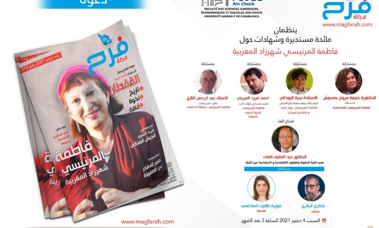 لتقريب القارئ من الملف الخاص لشهر دجنبر تنظم مجلة فرح وجامعة العلوم القانونية والاقتصادية والاجتماعية بالدار البيضاء مائدة مستديرة وشهادات حول: “فاطمة المرنيسي شهرزاد المغربية”،