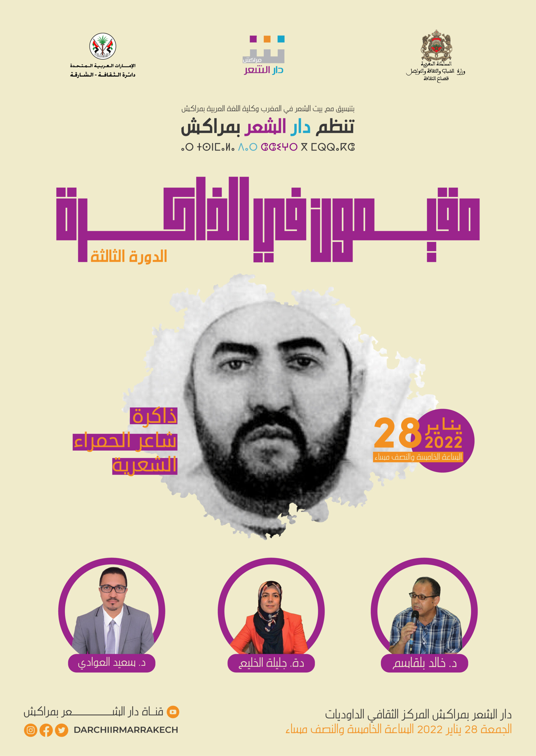 تحت إشراف وزارة الشباب والثقافة والتواصل، قطاع الثقافة، وبتنسيق مع كلية اللغة العربية بمراكش وبيت الشعر في المغرب، تنظم دار الشعر بمراكش فعاليات الدورة الثالثة للندوة الوطنية “مقيمون في الذاكرة”. وقد اختارت الدار أن تخصص فقرتها الجديدة، هذه السنة، ل”ذاكرة شاعر الحمراءالشعرية.. الشاعر محمد بن ابراهيم” بمشاركة النقاد والباحثين: الناقد الدكتور خالد بلقاسم الباحثة والشاعرة الدكتورة جليلة الخليع والناقد الدكتور سعيد العوادي. وسيحتضن مقر دار الشعر بمراكش (بالمركز الثقافي الداوديات)، يوم الجمعة 28 يناير 2022 على الساعة الخامسة والنصف فعاليات هذه الندوة الوطنية، والتي تأتي ضمن البرمجة الخاصة بالموسم الخامس 2021/2022.