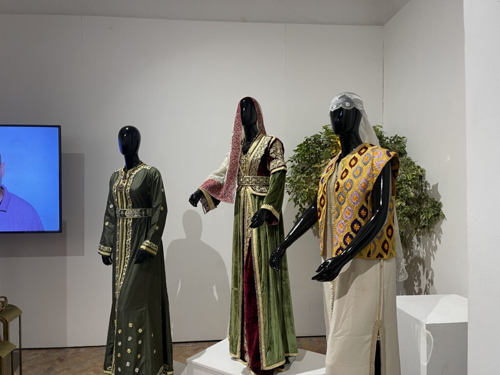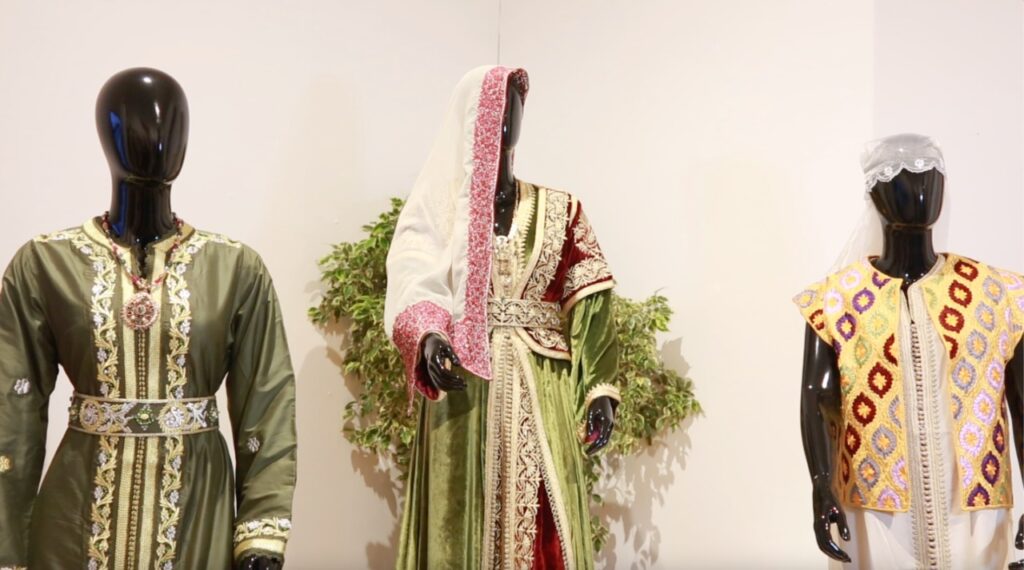 ويضم المعرض أيضا قفاطين “النطع” وهي من القفاطين المغربية الفاخرة المصنوعة من ثوب المخمل الأخضر الملكي المطرز بطرز النطع الذهبي، وترتديه العروس مع المضمة الذهبية والحلي المغربي ليلة الحناء التي تعتبر طقسا من طقوس العرس المغربي.