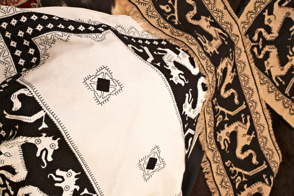 الألوان السائدة هي الأبيض والأسود والاحمر الداكن. يتميز بزخارف تمثل الأسود والغريفين الحيوان الميتافيزيقي والطيور والنسور والطاووس والأرانب والفيلة والحيوان الغامض، التنين. يمكن عمل التطريز على الصوف والقماش والكتان والأكثر دقة على القماش المسمى الخارقة السيسية.