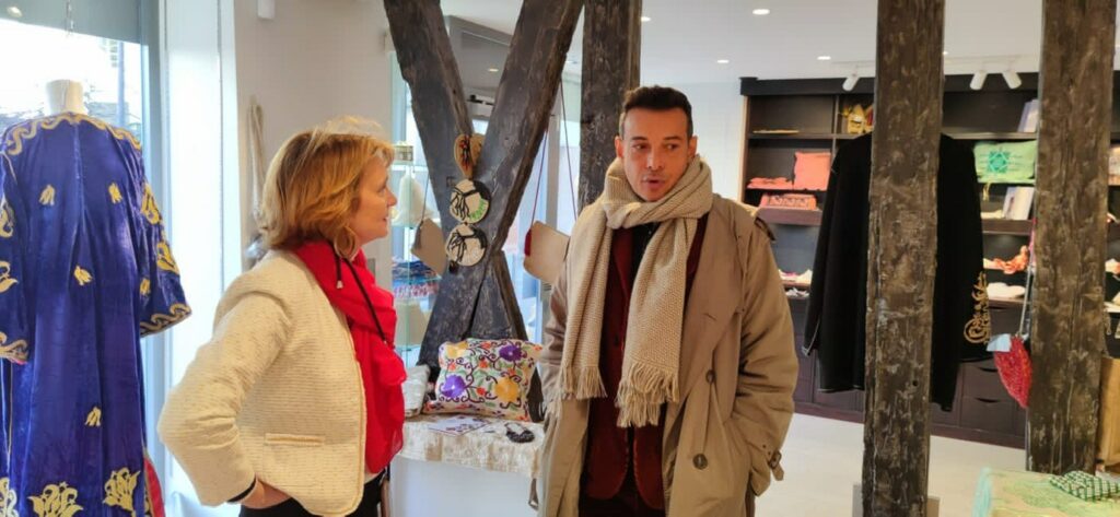 حين لقائها به في إحدى الحفلات بفندق المأمونية بمراكش سنة 2010، لم تكن فوزية طالوت المكناسي، رئيسة شبكة الصانعات التقليديات دار المعلمة، تعلم أنها ستلتقي بهرم الإبداع في عالم الموضة “إيريك تيبوش”. صدفة جميلة مكنتهما من تبادل أطراف الحديث ومناقشة كل شيئ ولا شيئ، إلى أن جمعهما القاسم المشترك” وضعية المرأة في الصناعة التقليدية والموضة”. من هنا نشأت عَلاقة وطيدة وصداقة مثنية هدفها العمل الإنساني، ومنذ ذلك التاريخ أصبح إيريك تيبوش ء وبشكل تطوعي ء الراعي الرسمي لشبكة الصانعات التقليديات كما بات مديرا فنيا لقفطان دار المعلمة ومن بعد لدار المعلمة ككل. لم يبخل ولم يتأخر ابدا لإعطاء كل ما يستطيع لحرفيات دار المعلمة فهو المؤطر والمعلم والصديق والاخ لكل هؤلاء الصانعات يدافع عنهن ويحمل قضيتهن العادلة والإنسانية إلى عدة مؤسسات وهيئات دولية.