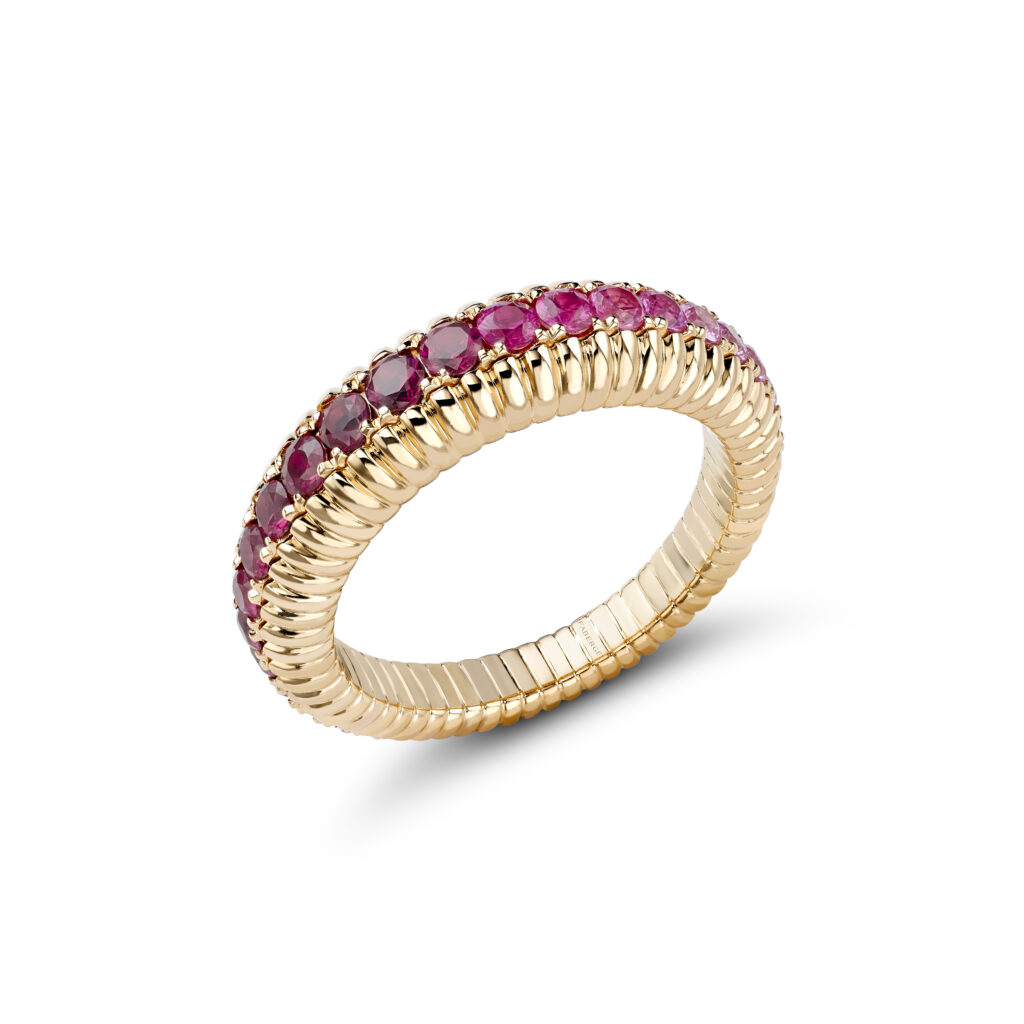 يُصمّم خاتم Colours of Love Rose Gold Tapered Fluted Ruby and Pink Sapphire Ombre Ring حسب الطلب من الذهب الوردي المخدّد عيار 18 قيراط، ويتألّق بأحجار ياقوت مستوردة بطريقة مسؤولة من منجم Gemfields في الموزمبيق، تتدّرج بأجمل حلّة وصولًا إلى حجر السافير الوردي.