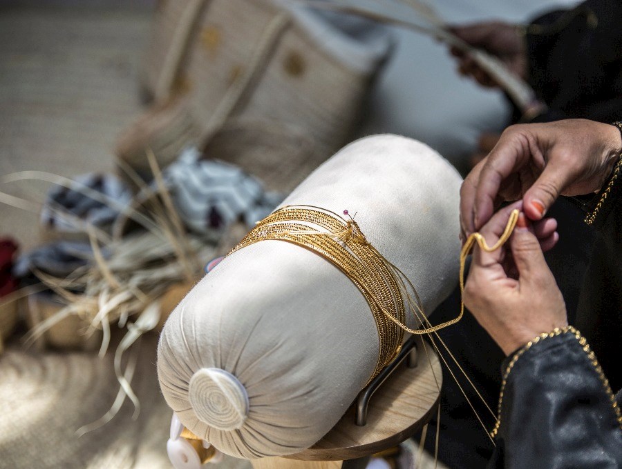 بأنامل مصبوغة بالحنّاء، تجدّل الإماراتية مريم الكلباني خيوطًا مختلفة لتصنع تصميمًا فريدًا تُزيَّن به الملابس، أمام عيون شابة ترغب في تعلّم حرفة “التلي” التقليدية المدرجة على قائمة اليونسكو للتراث الثقافي غير المادي للبشرية.