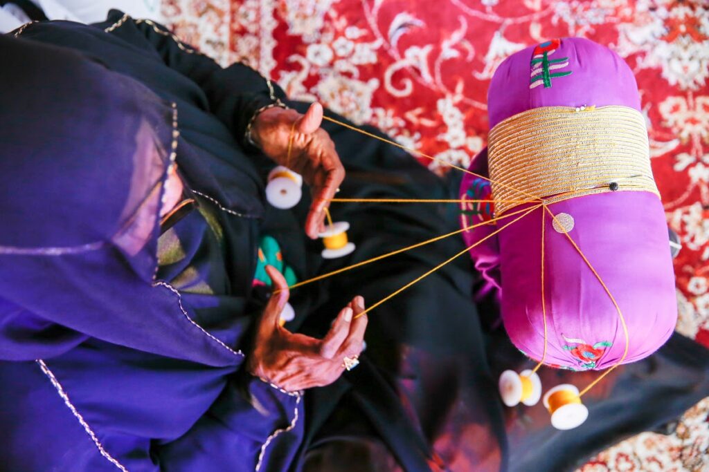 في أحد أكشاك “مهرجان الحرف والصناعات التقليدية” في منطقة العين في إمارة أبوظبي، تراقب طالبة المحاسبة ريم الكتبي (23 عامًا) يدَي الحرفيّة السبعينية وهي تنسج على مخدّة مدوّرة تسمّى “موسدة” مثبّتة أمامها على حامل معدني، خيوطًا، أحدها فضيّ اللون.