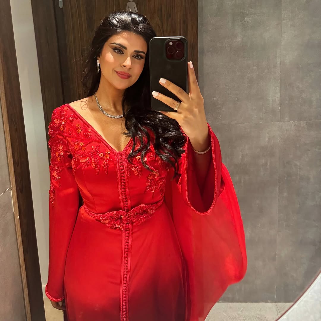 واختارت قفطانًا مغربيًا عصريًا باللون الأحمر الجريء، مما أضفى على إطلالتها مزيجًا من الأناقة التي توازن بين الأصالة والمعاصرة.