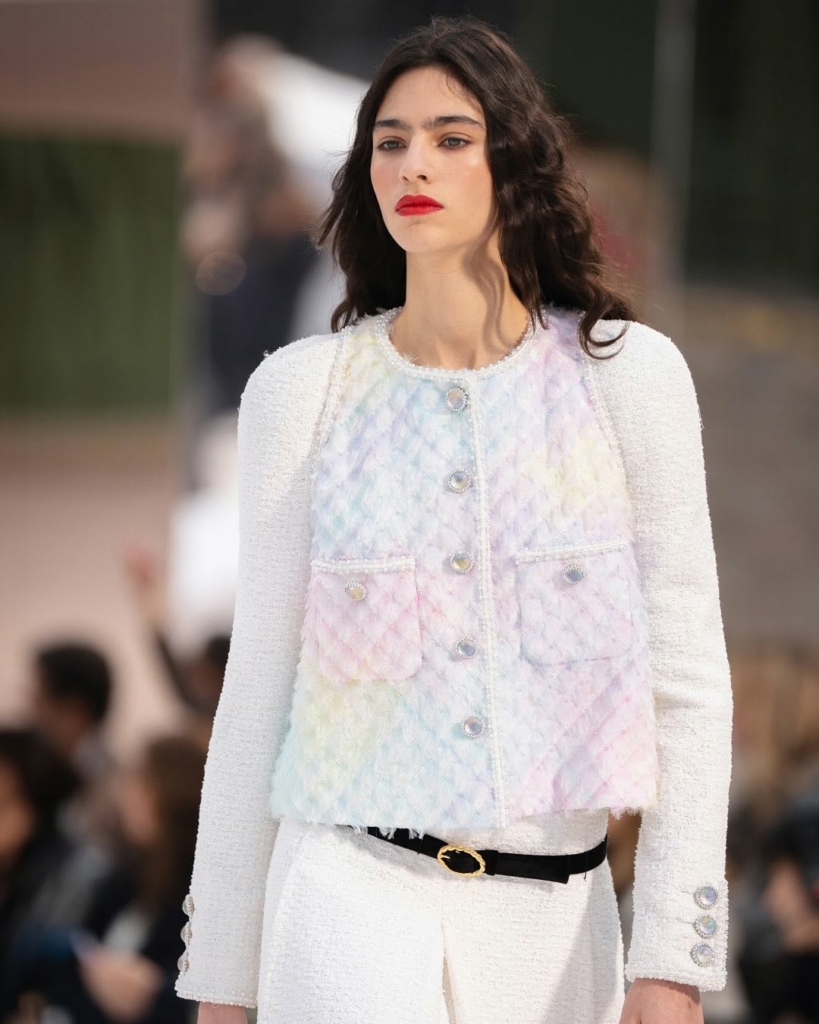 ويبدأ يوم “شانيل” ببدلات تتعدد ألوانها، بين الأبيض والأصفر الباستيل والأخضر البحري، ثم يتواصل بألوان أكثر إشراقا، ثم ينتهي بفساتين سهرة باللون الأزرق الداكن والأسود.