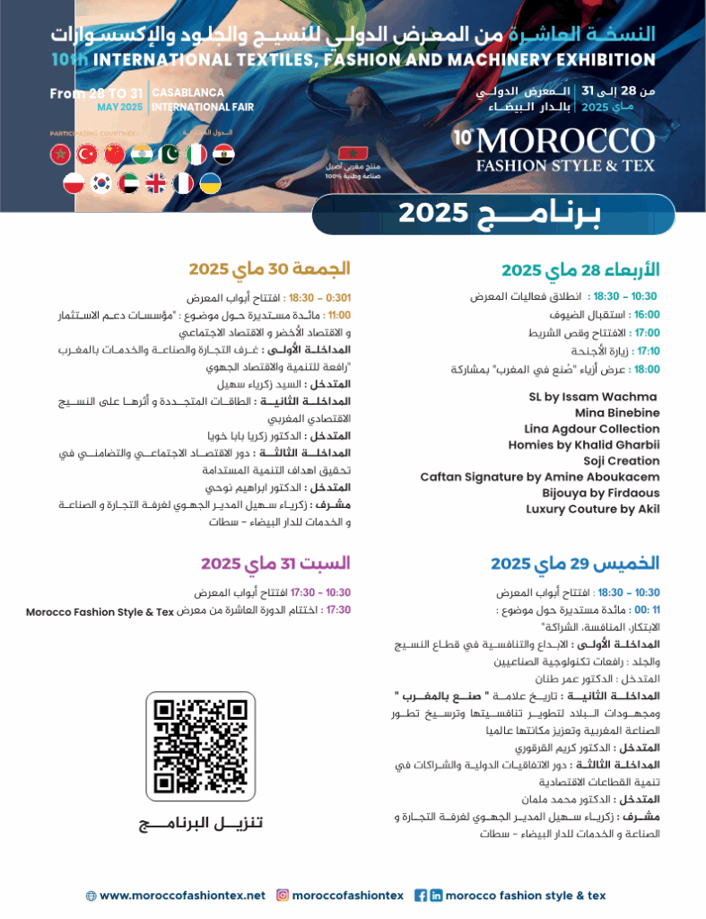 كما ستُنظم لقاءات B2B ومسابقات مهنية تشكل فضاءً للتفاعل بين الفاعلين في مجال الأزياء والنسيج وطنيا ودوليا.
