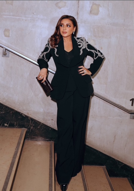 أما البنطلون الواسع فحافظ على الطابع الكلاسيكي للبدلة، بينما منح التطريز الفضي الإطلالة بريقا مسائيا راقيا، خاصة مع تنسيق حقيبة كلاتش داكنة ومجوهرات لامعة.