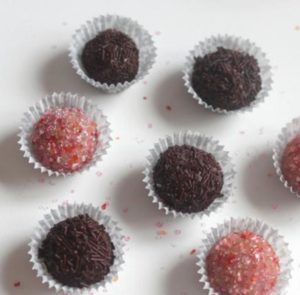 دعي طفلك يأخذ كمية صغيرة ويشكلها على شكل كرة صغيرة ثم يفندها في قطع الشوكولاتة المبشورة او السكر الملون