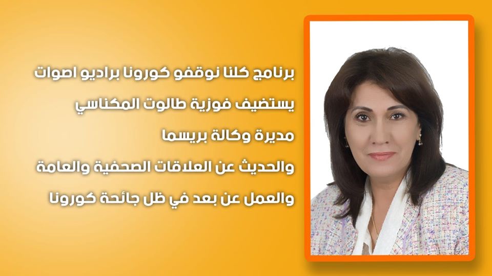 برنامج كلنا نوقفو كورونا براديو اصوات يستضيف فوزية طالوت المكناسي مديرة وكالة بريسما والحديث عن العلاقات الصحفية والعامة والعمل عن بعد في ظل جائحة كورونا