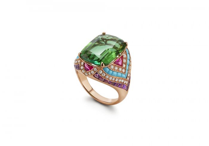 من علامة بولغاري نختار خاتم من مجموعة Barocko بتصميم زخرفي أنيق يحمل أنوثة تاريخية من وحي عصر الباروك بفخامة الذهب الوردي والماس والفيروز والروبليت والجمشت والبريدوت.