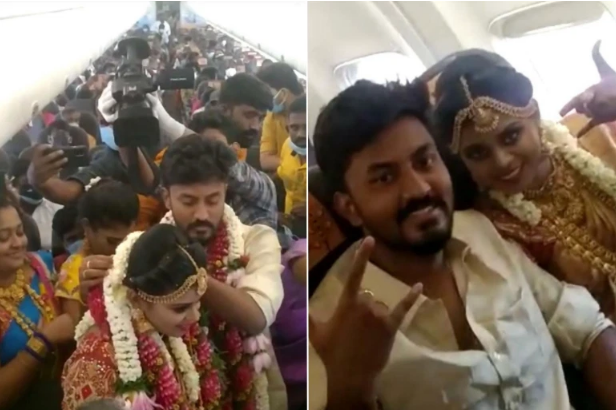 عروسان هنديان لم يتمكنا من عقد قرانهما على الأرض بسبب قيود كورونا فاستأجرا طائرة وعقدا قرانهما فيها بحضور 160 شخصا.
