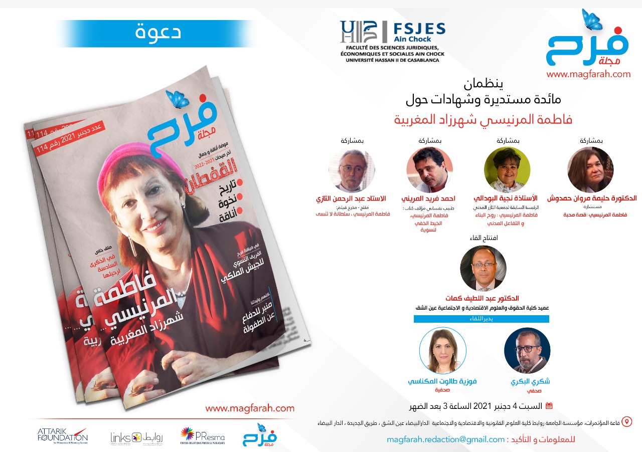 لتقريب القارئ من الملف الخاص لشهر دجنبر تنظم مجلة فرح وجامعة العلوم القانونية والاقتصادية والاجتماعية بالدار البيضاء مائدة مستديرة وشهادات حول: “فاطمة المرنيسي شهرزاد المغربية”،